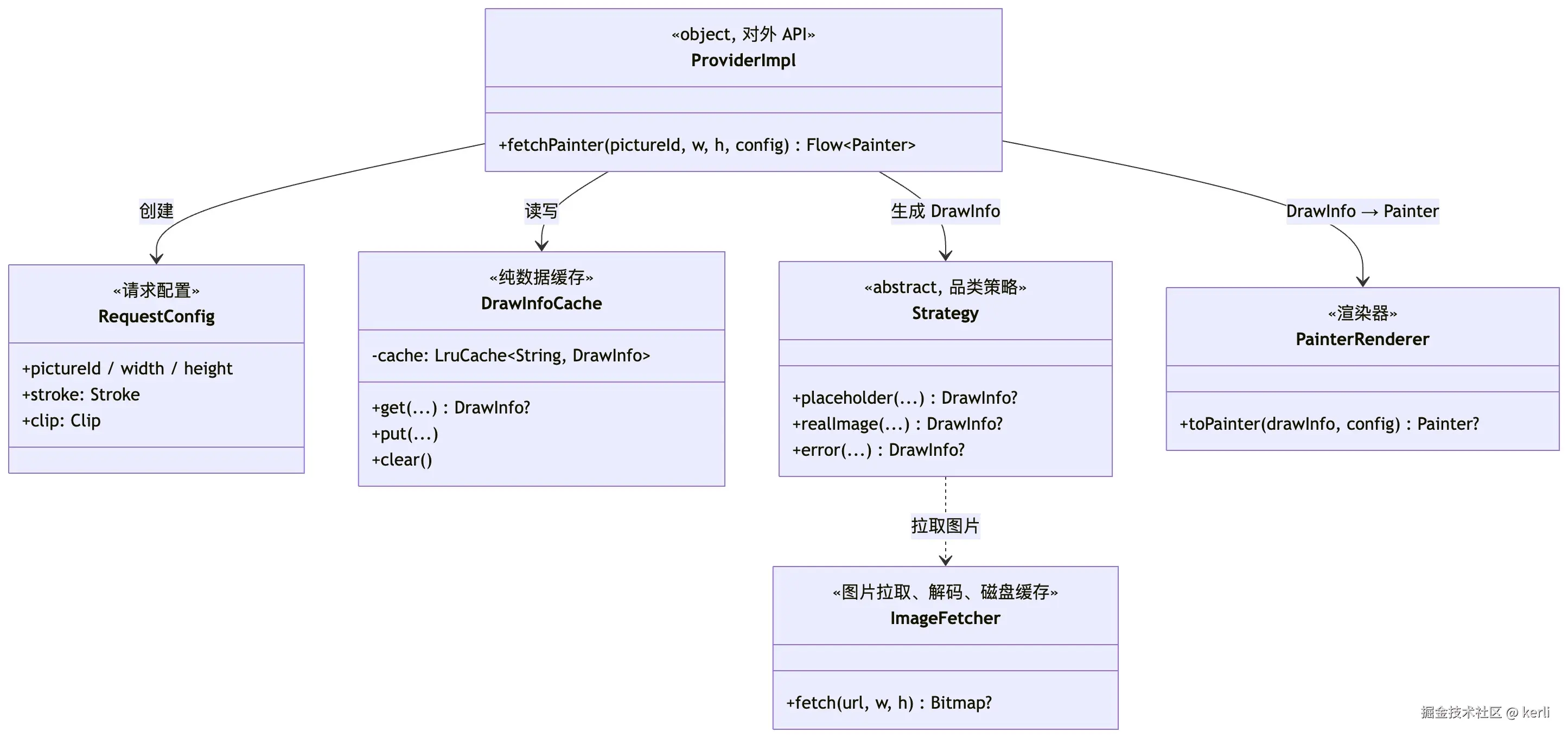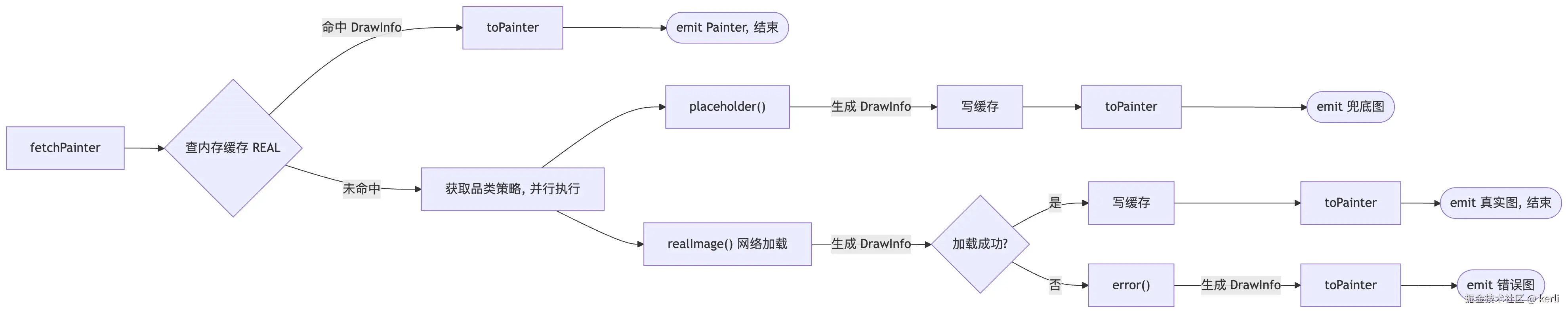 Flow<Painter>切换为Flow<Bitmap>或其他形态,只需替换渲染层,策略层和缓存层完全不用改动。如果策略直接返回 Painter,输出形态的变更会波及策略层和缓存层。 - 方便使用方自定义 :如果支持使用方自定义兜底图,让使用方传入一个 DrawInfo(如