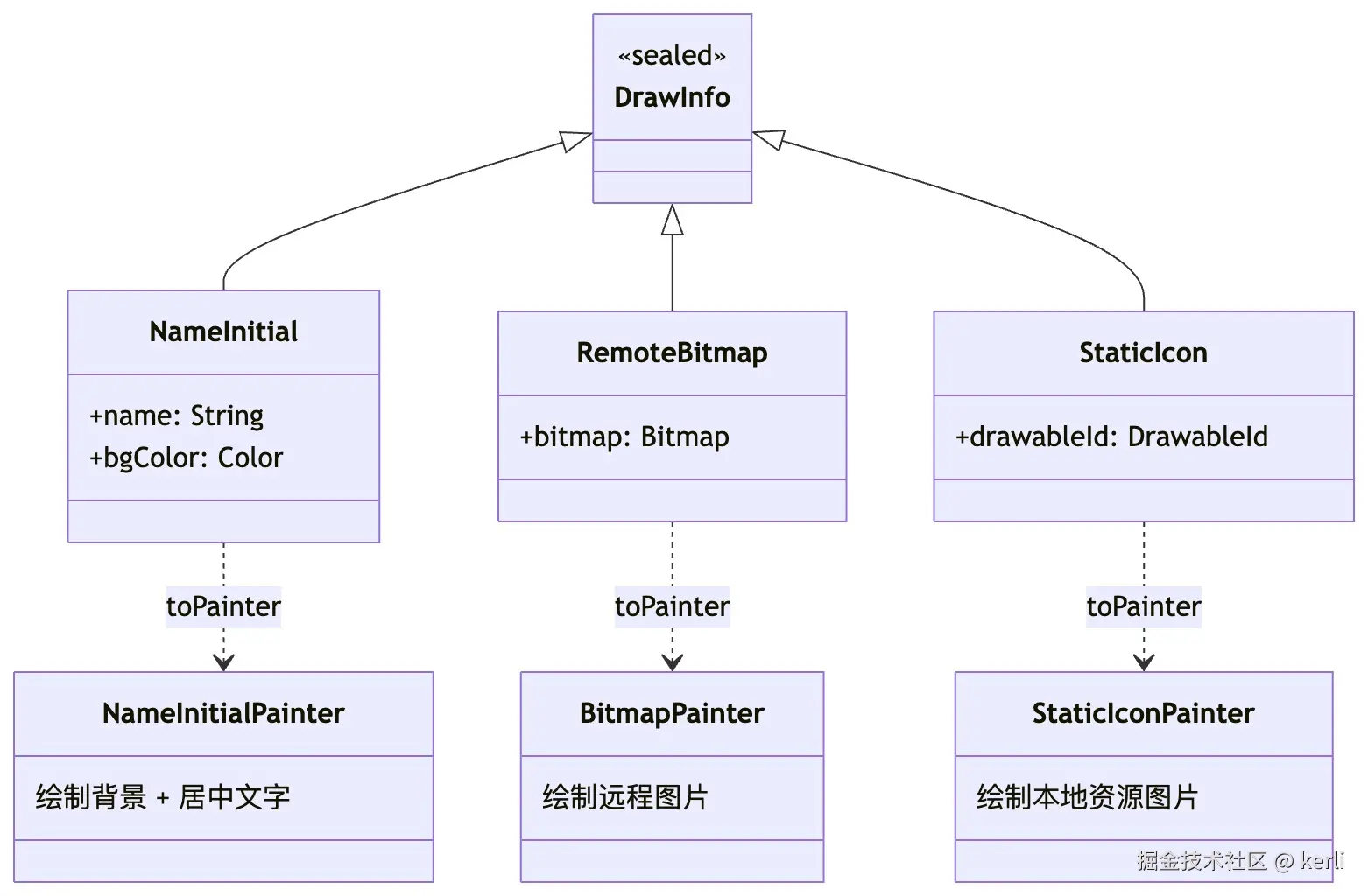 DrawInfo 是一个 sealed class,描述"画什么",它是策略层和渲染层之间的中间产物:策略层根据业务逻辑决定要展示什么内容(一个文字+背景色、一张网络拉取的 Bitmap、或者一个本地资源 ID),把这些信息封装为 DrawInfo 返回;渲染层再结合调用方的渲染配置(剪裁、描边)将 DrawInfo 转化为最终的 Painter。