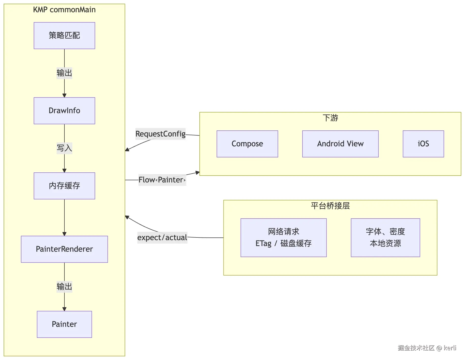 如何设计一个方案,让加载、缓存、自绘逻辑在 commonMain 中共享,同时适配三端的渲染消费方式?