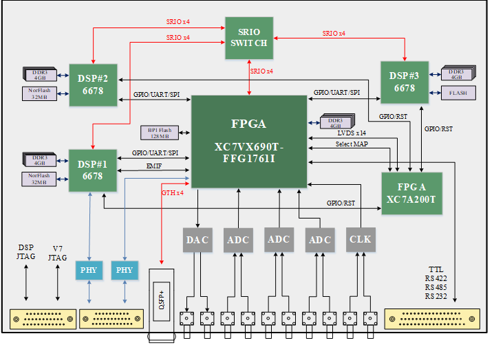 • FPGA预处理提速:主FPGA搭载XC7K690T-2FFG1761I,搭配4GB 64bit DDR3与128MB NorFlash,承担模拟信号采集、预处理核心工作,并行处理优势实现高速数据零延迟分流,为后端DSP减负增效;