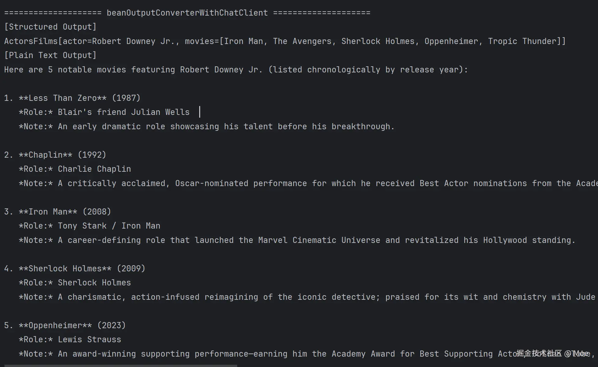 printComparison("beanOutputConverterWithChatClient", actorsFilms, plainText);