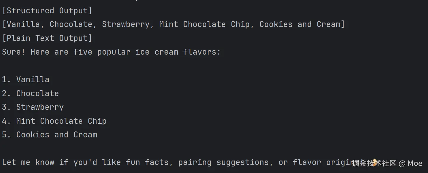 printComparison("listOutputConverterWithChatClient", flavors, plainText);