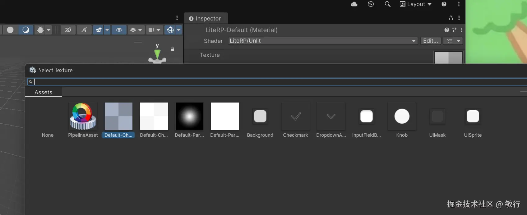 在 Materials 文件夹下创建 LiteRP-Default 材质,并指向 Unlit.Shader。