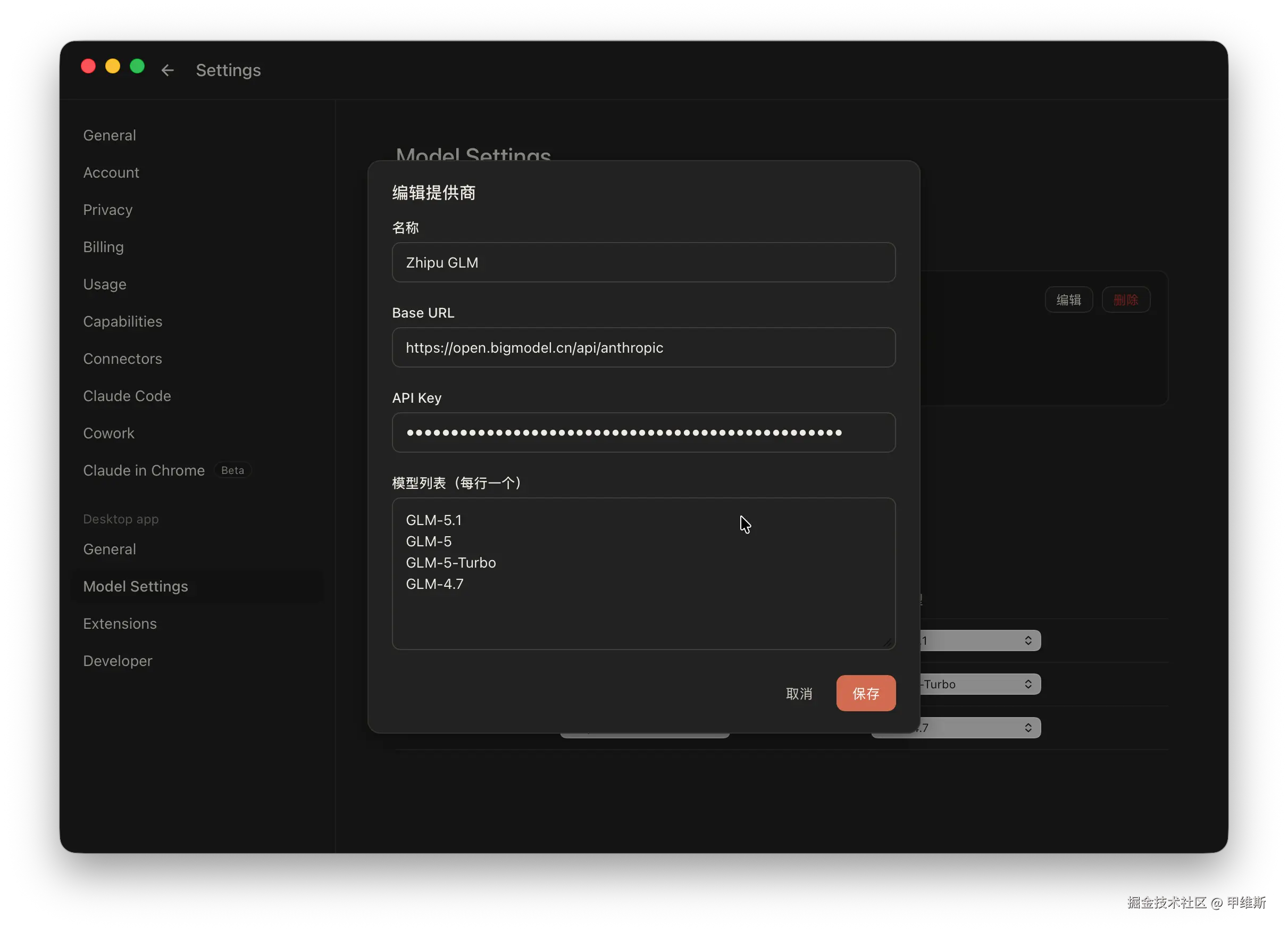 - 支持配置界面模型与实际模型的映射关系(如 Opus 4.7 → GLM-5.1、Sonnet → GLM-5-Turbo)。