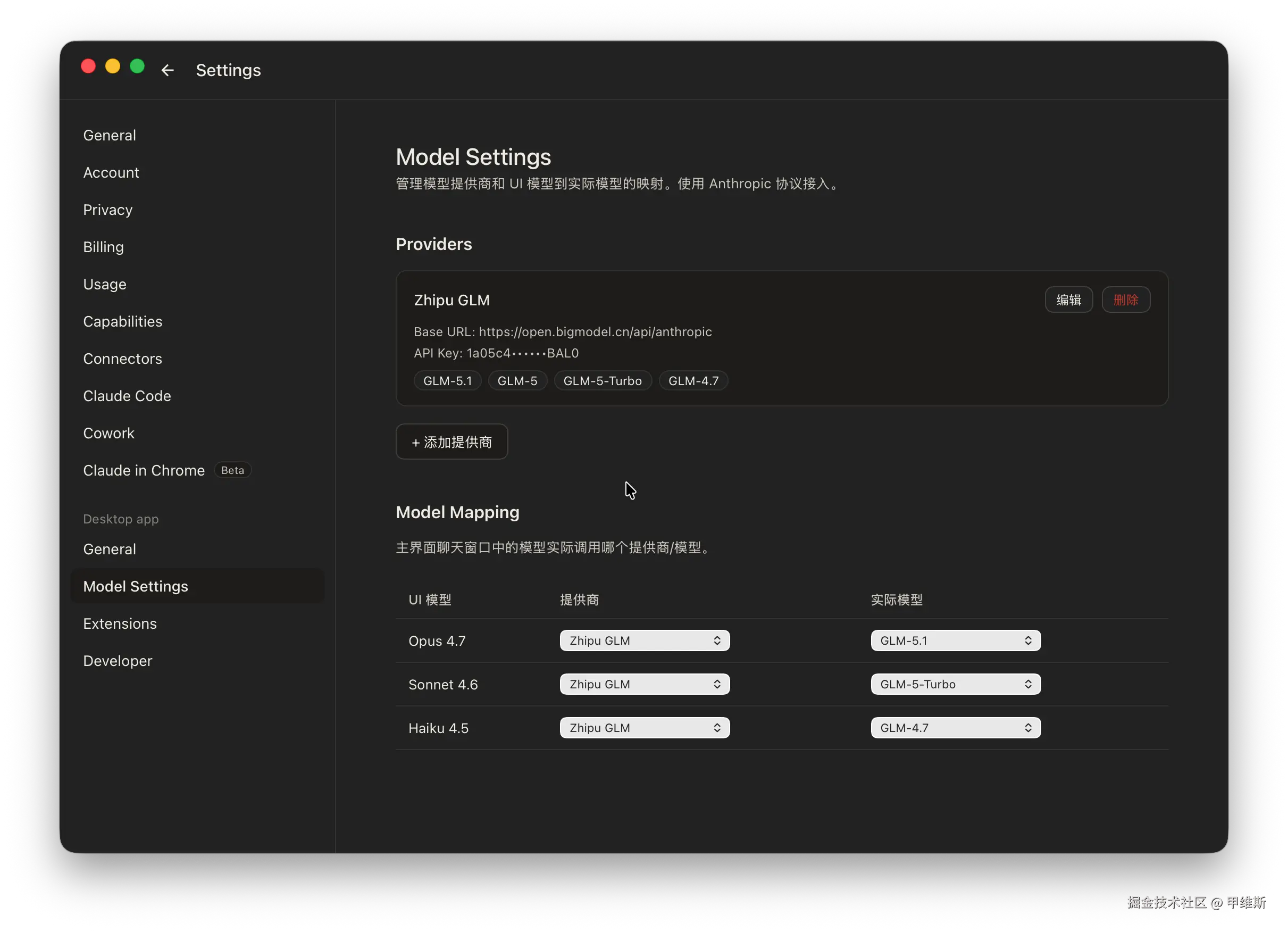 模型设置功能界面,包含了提供商管理和模型映射两部分,这两部分都做得非常清晰,一看就懂。
