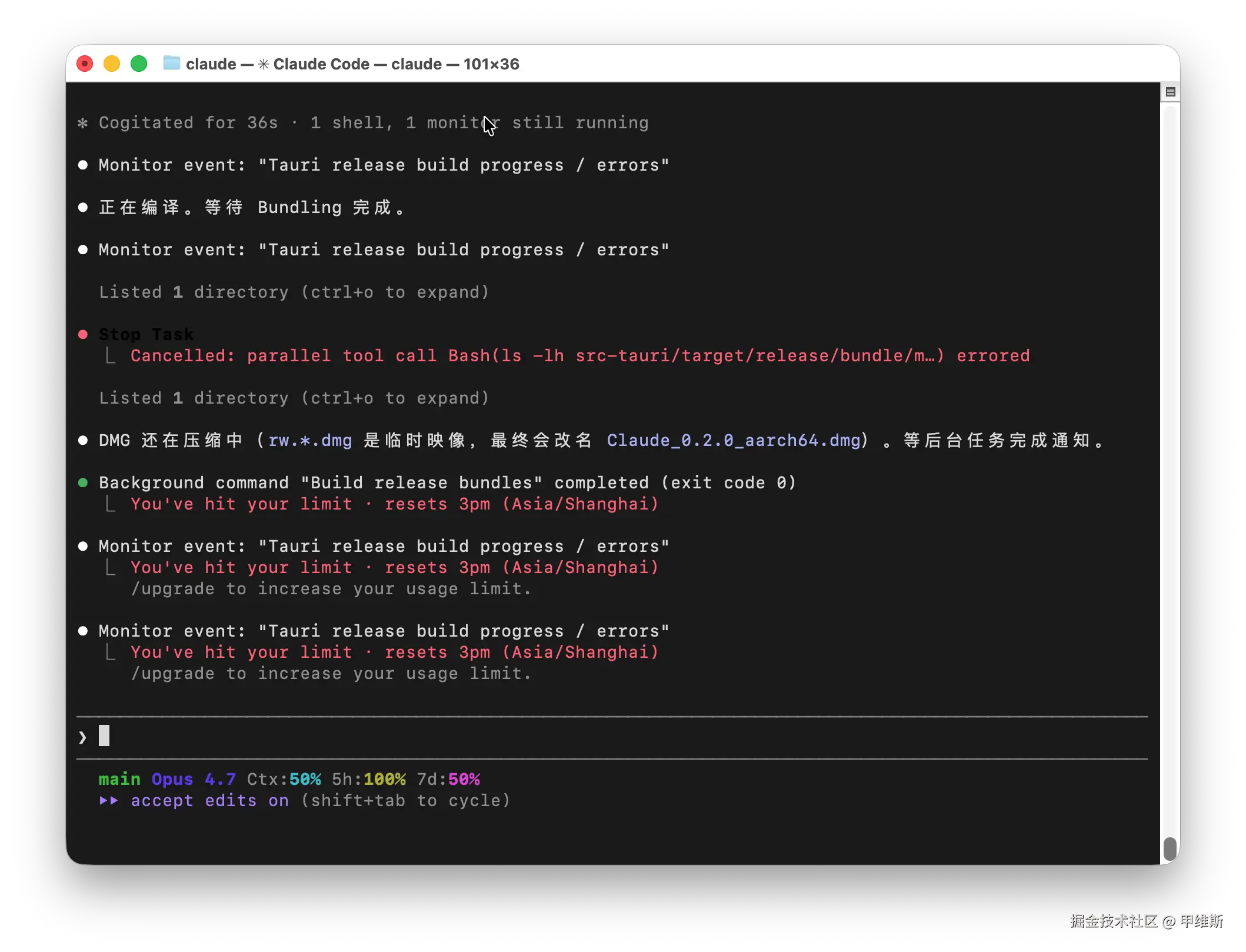 DMG 还在压缩中(`rw.*.dmg` 是临时映像,最终会改名 `Claude_0.2.0_aarch64.dmg`)。