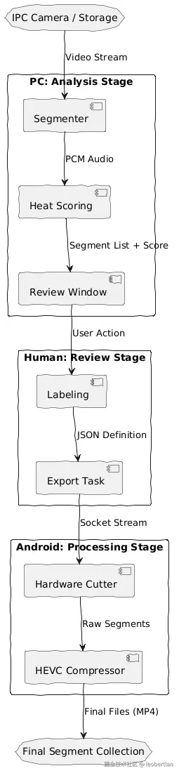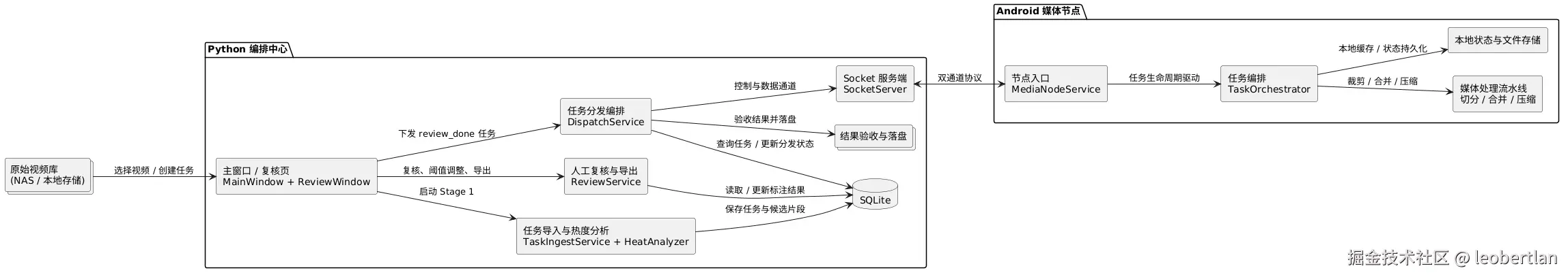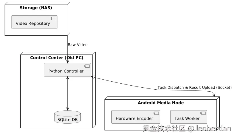 在明确了算法核心后,我们需要一套架构将"散落"在硬盘里的视频、运行在旧电脑里的算法,以及闲置的移动算力有机结合起来。由于算力资源极度不对称(老旧电脑 GPU 弱、编码差;Android 手机端 NPU/VPU 编解码强),我们将系统设计为**"任务编排中心 + 分布式执行节点"**的拓扑结构。