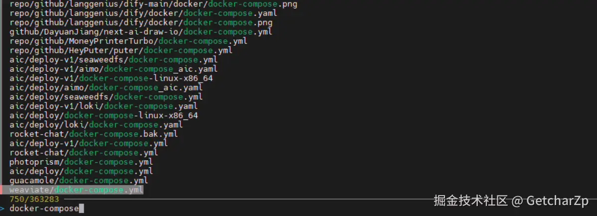 在弹出的交互界面里敲入几个字母(比如 docker-compose),选中后回车,fzf 会输出文件路径。