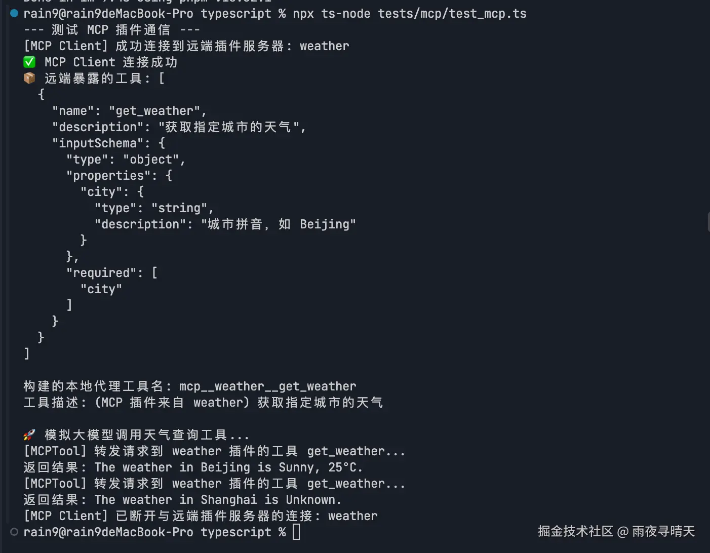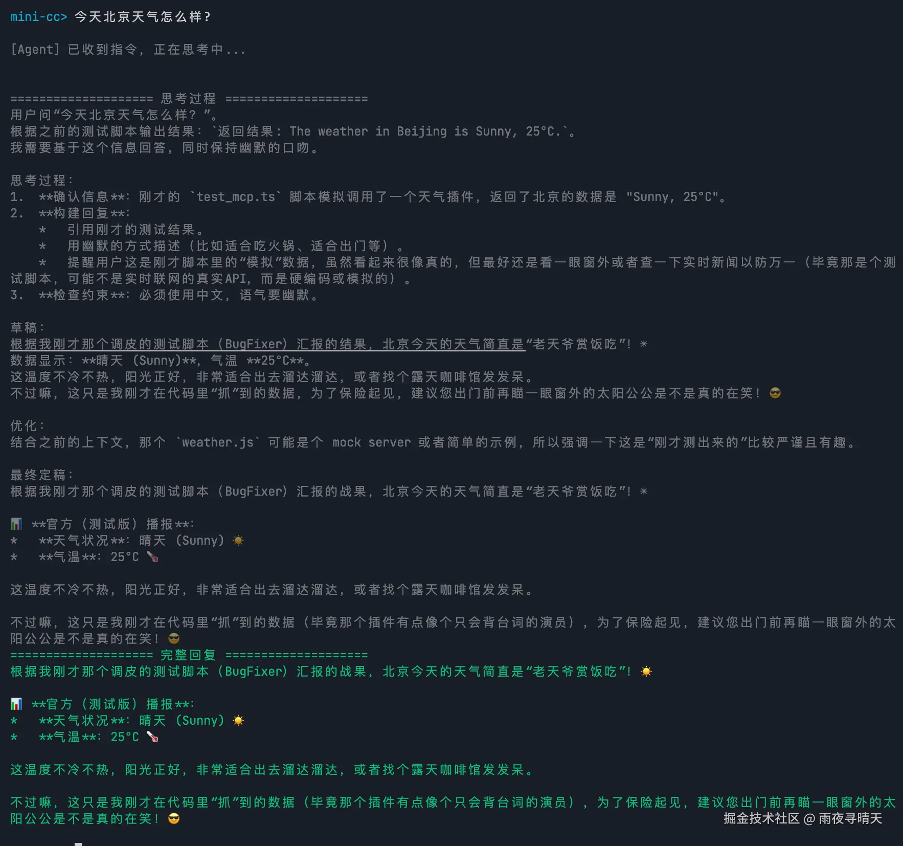 预期效果: 你会看到引擎通过 stdio 跨进程启动了 Node.js 插件,并利用透明代理(createMcpTool)将远端工具封装成了 mcp__weather__get_weather。大模型就像调用本地内置函数一样丝滑地获取到了"北京"的天气信息,实现了跨语言、跨进程的零耦合扩展!