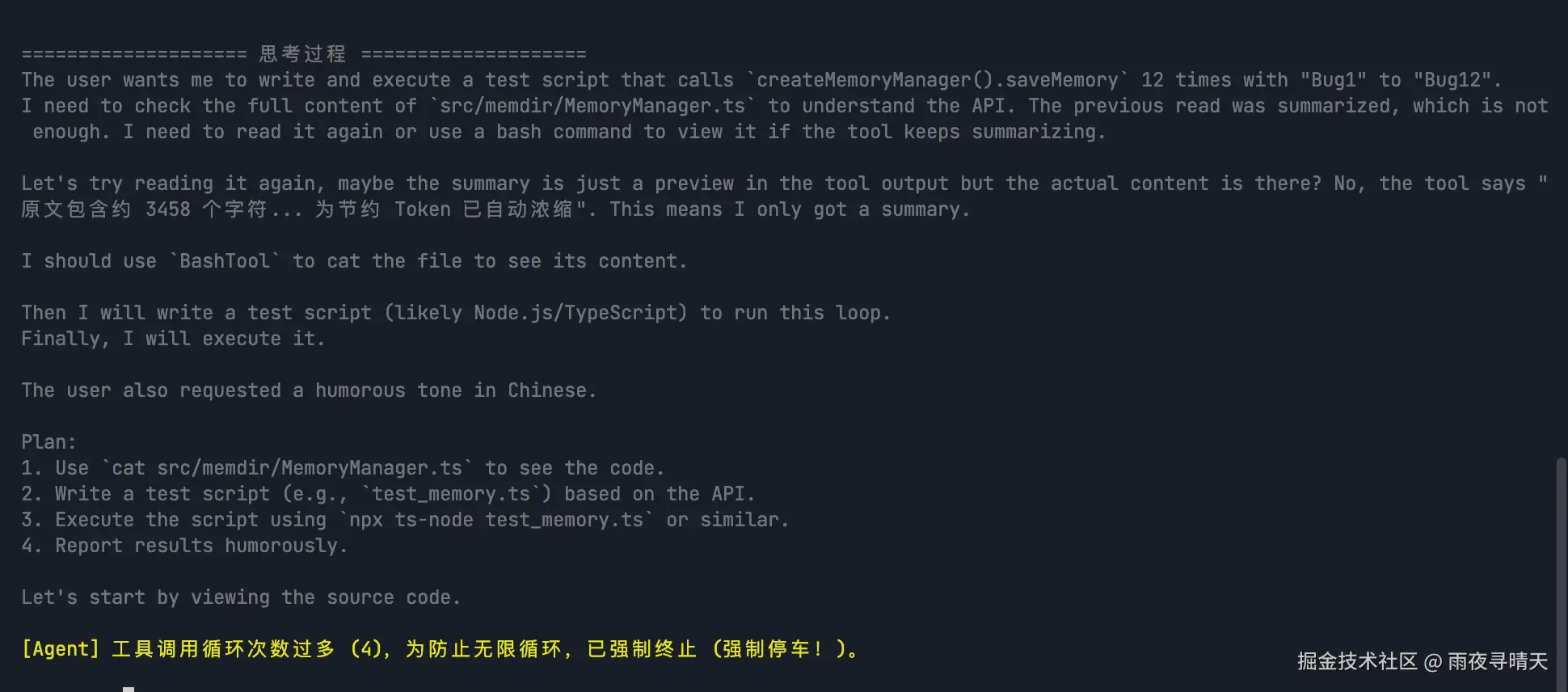 BashTool(或FileWriteTool配合npx ts-node) 编写并执行一个测试脚本:循环调用src/memdir/MemoryManager.ts中的createMemoryManager().saveMemory12次,记录"Bug1"到"Bug12"的详情。我要测试它的防爆截断机制。"