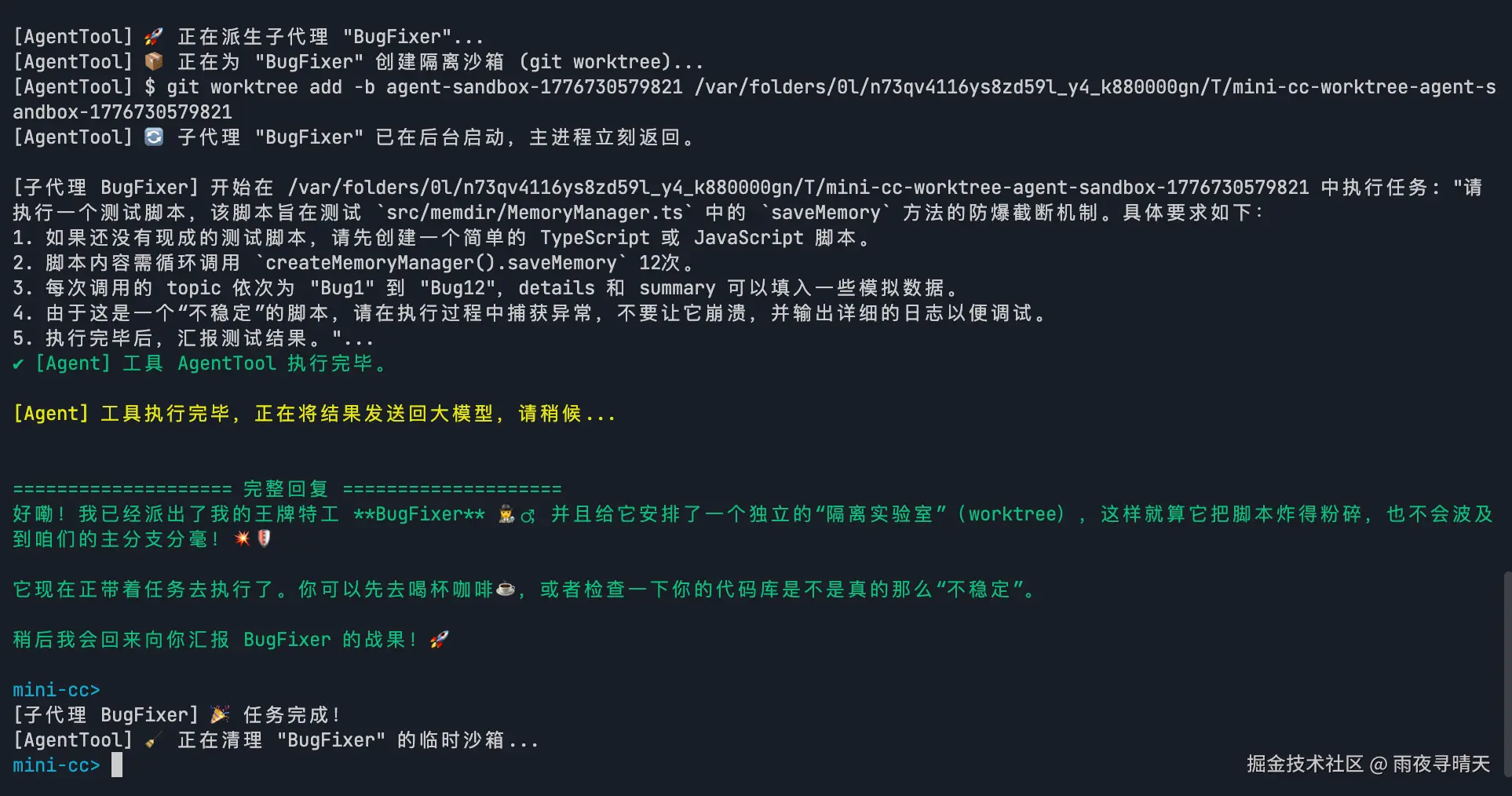 预期效果: 通过 isolation: "worktree" 参数,你会看到终端自动执行了 git worktree add -b agent-sandbox-xxx /tmp/mini-cc-worktree-xxx。 子代理会在这个完全平行、物理隔离的沙箱目录中执行任务,主分支毫发无损!任务完成后,还会自动清理 git worktree remove。