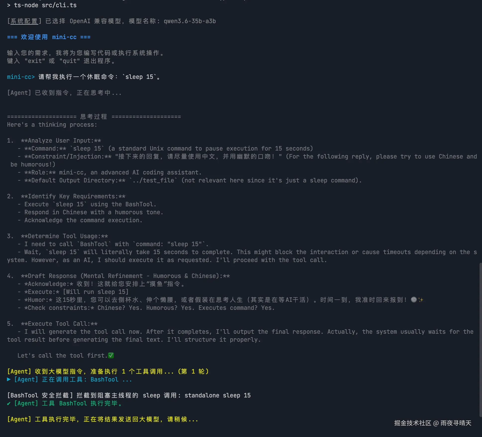 预期效果: 你会在终端看到 [BashTool 安全拦截] 拦截到阻塞主线程的 sleep 调用 的黄色警告。 这是因为 mini-cc 在源码中通过正则表达式(detectBlockedSleepPattern)精准识别了长时的"孤狼" sleep 命令。大模型有时会为了等编译完成而傻傻地 sleep,这会导致我们的主进程被无意义阻塞。拦截后,引擎会提示 AI 改用后台监控或其他工具。