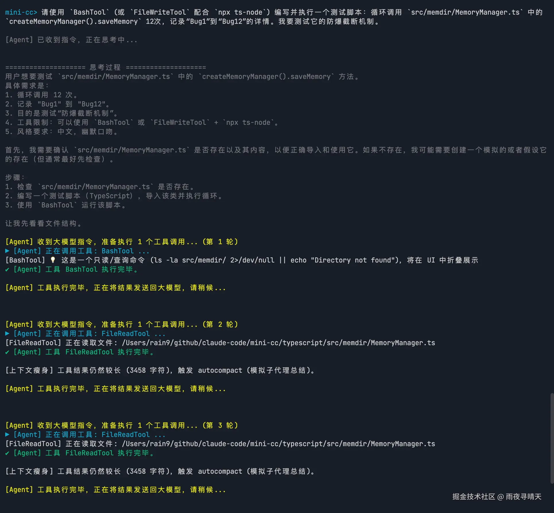 mini-cc/typescript目录下执行了pnpm install和pnpm run build。 为了方便演示工具链,你可以通过npx ts-node src/cli.ts(如果有完整入口) 或执行各个单元测试文件来模拟大模型交互。