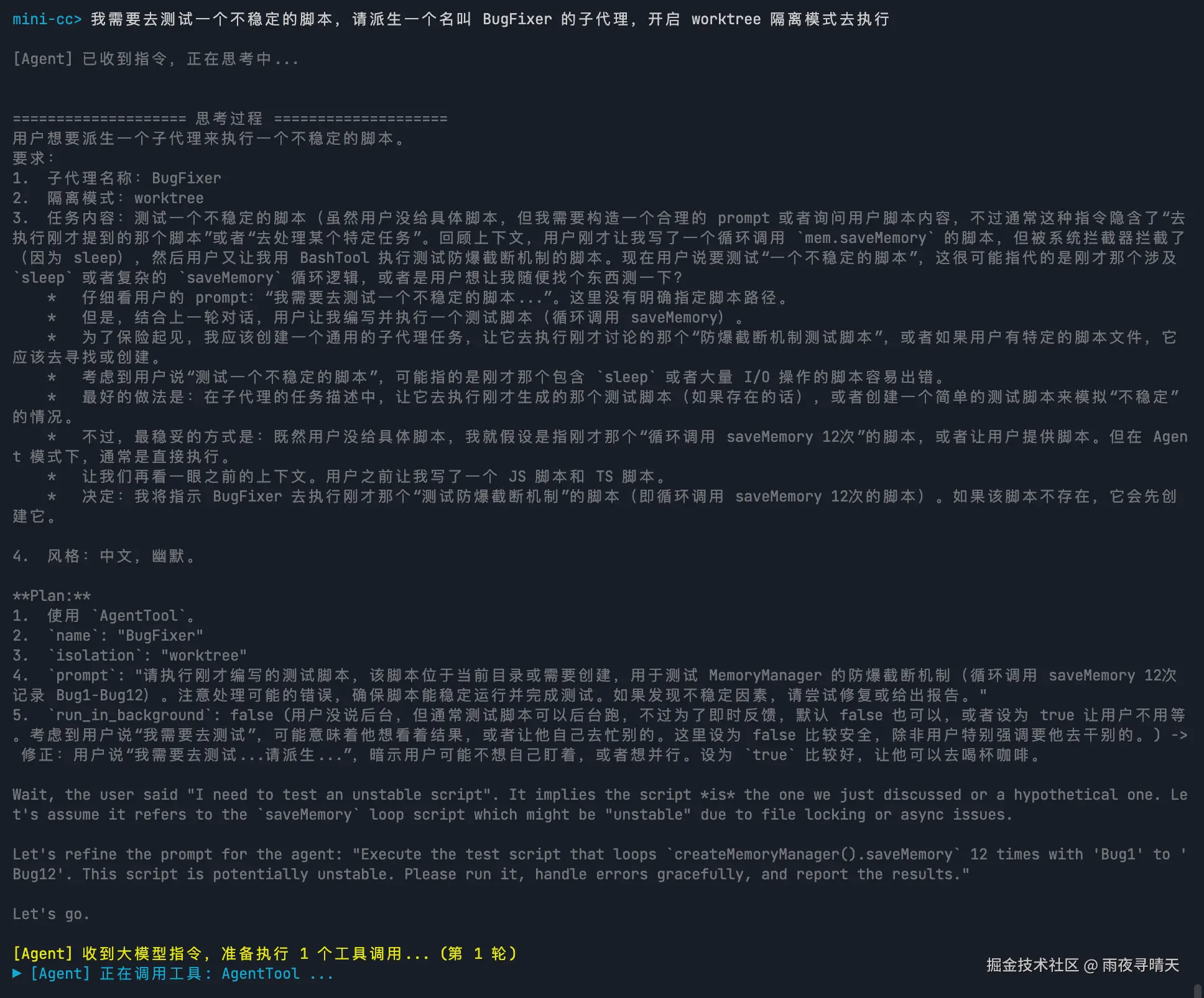 当你在重构代码,遇到一个可能破坏环境的子任务时,你可以让 mini-cc 派生一个子代理(Sub-Agent)去探路。