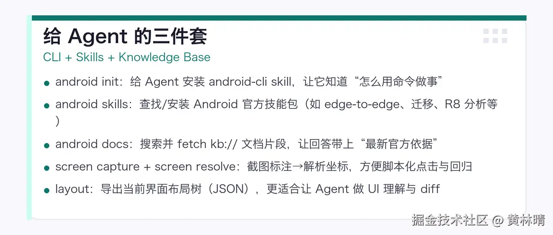Android CLI 的"杀手锏"不在于它能不能跑命令,而在于它把 Agent 最缺的三类能力补齐了:可执行的规范、可检索的最新知识、可操作的设备界面。