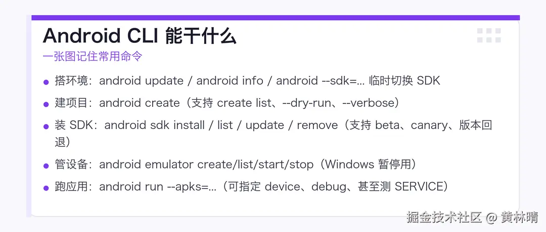 Android CLI 的定位很清晰:它不是替代 Android Studio,而是让你在终端(尤其是 Agent/CI 环境)也能用官方方式把流程跑顺,然后再无缝切到 Android Studio 做精细化开发与调试。