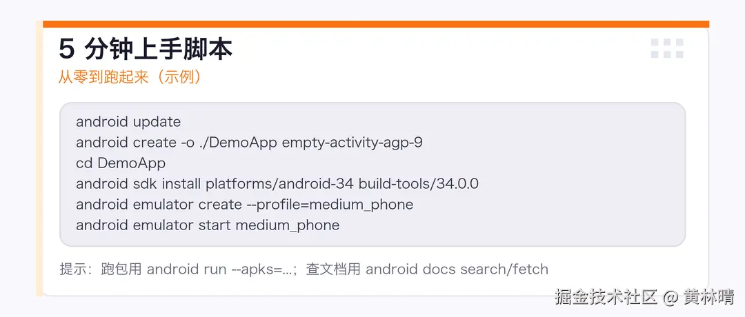 把 android update、android create、android sdk install、android emulator ...、android run 这条链路写进脚本,让任何人/任何 Agent 在新机器上都能"一键跑通"。