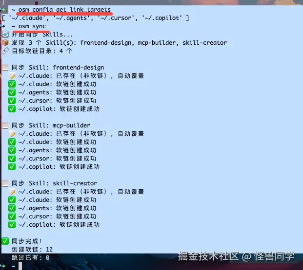 link_targets),在指定 Agent 的技能目录(如~/.claude/skills/)下创建指向中央仓库的软链接 。这意味着,你实际上只需管理中央仓库这一份技能,然后通过osm sync命令,就能一键把这份技能同步到所有配置好的 Agent 中,实现高效管理。