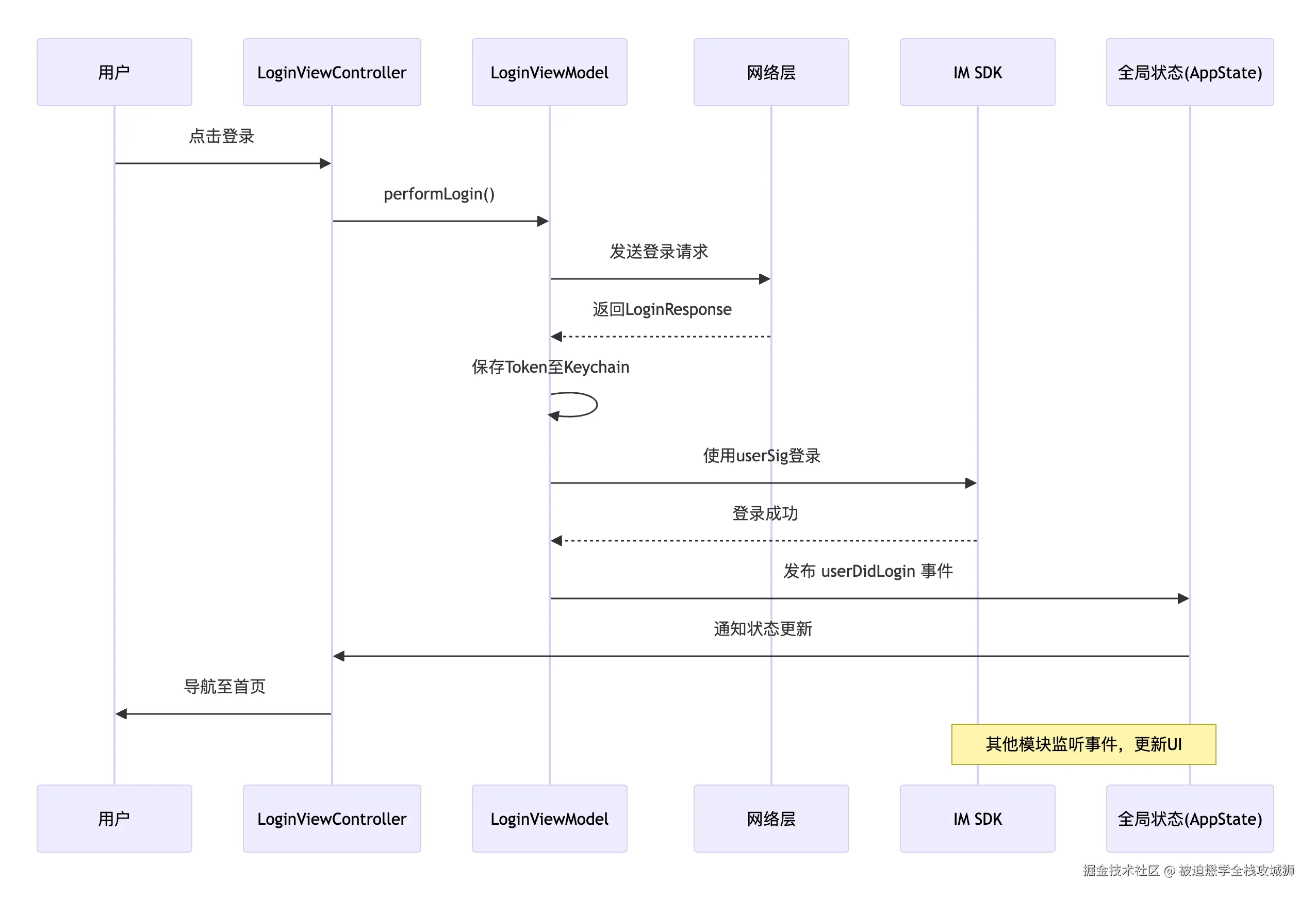 这个过程体现了多个组件的协同:UI状态驱动、安全网络请求、凭据安全存储、第三方SDK初始化、全局状态同步。任何一个环节的失败都需要有明确的错误恢复机制,例如,IM登录失败不应导致整个登录流程失败,但应记录日志并可能降级使用部分功能。