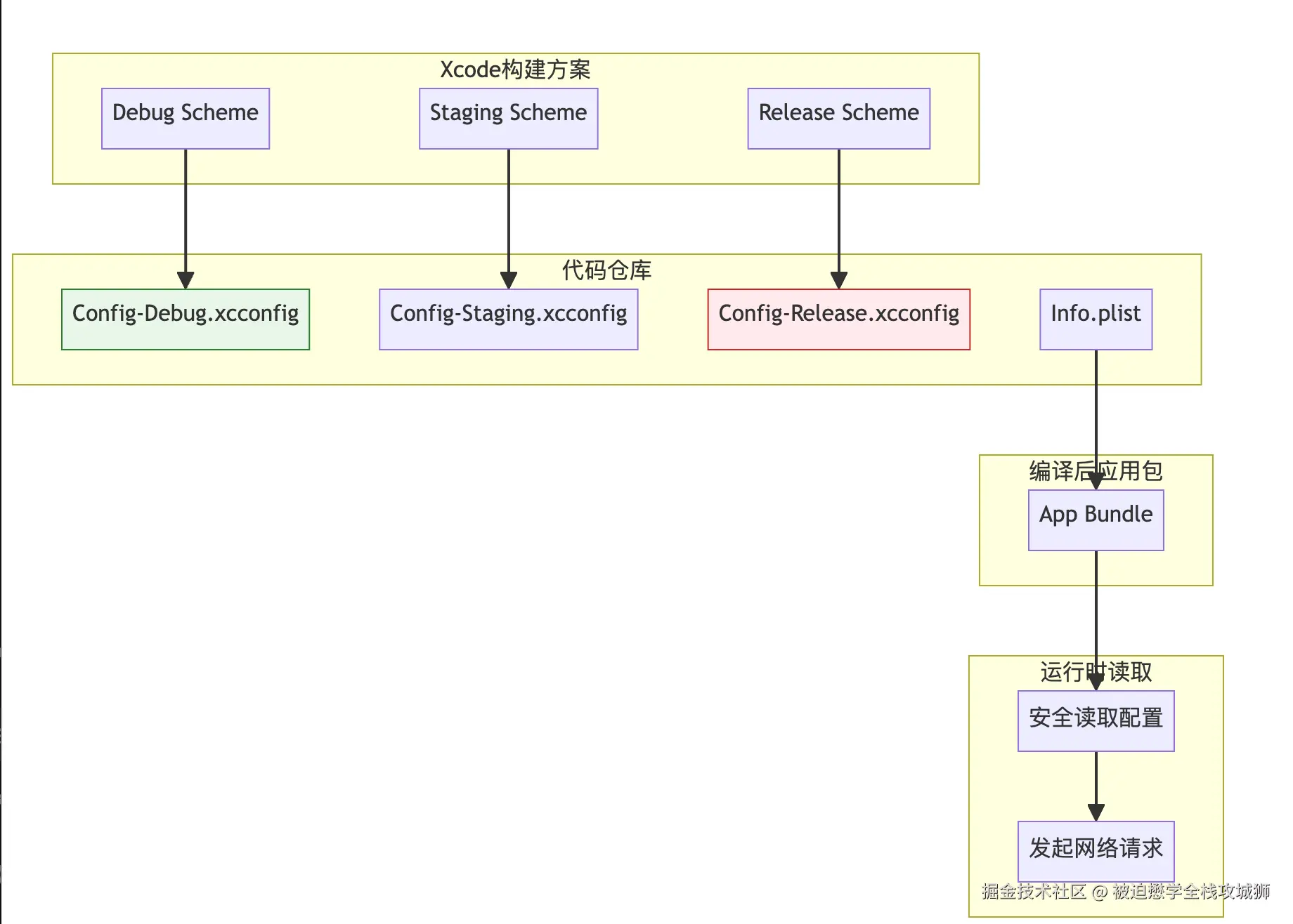 下图展示了基于xcconfig的多环境安全配置管理流程