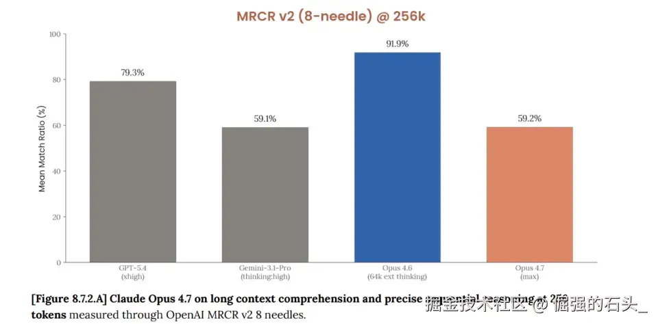 Anthropic自己的数据:百万token长上下文记忆测试(MRCR v2),Opus 4.6得分78.3%,Opus 4.7得分32.2% 。暴跌46个百分点。联网搜索BrowseComp评分也从83.7%掉到79.3%,被GPT-5.4的89.3%甩开一截。