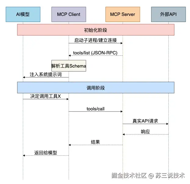 MCP Server启动时,会通过JSON-RPC向Client发送一个tools/list消息,里面包含了该Server提供的所有工具的名称、描述、参数Schema。