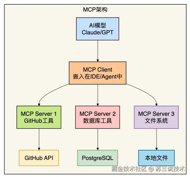 MCP(Model Context Protocol)是一个客户端-服务器架构的协议,专门用来把外部工具(如文件系统、数据库、GitHub API)"包装"成AI模型可以调用的函数。