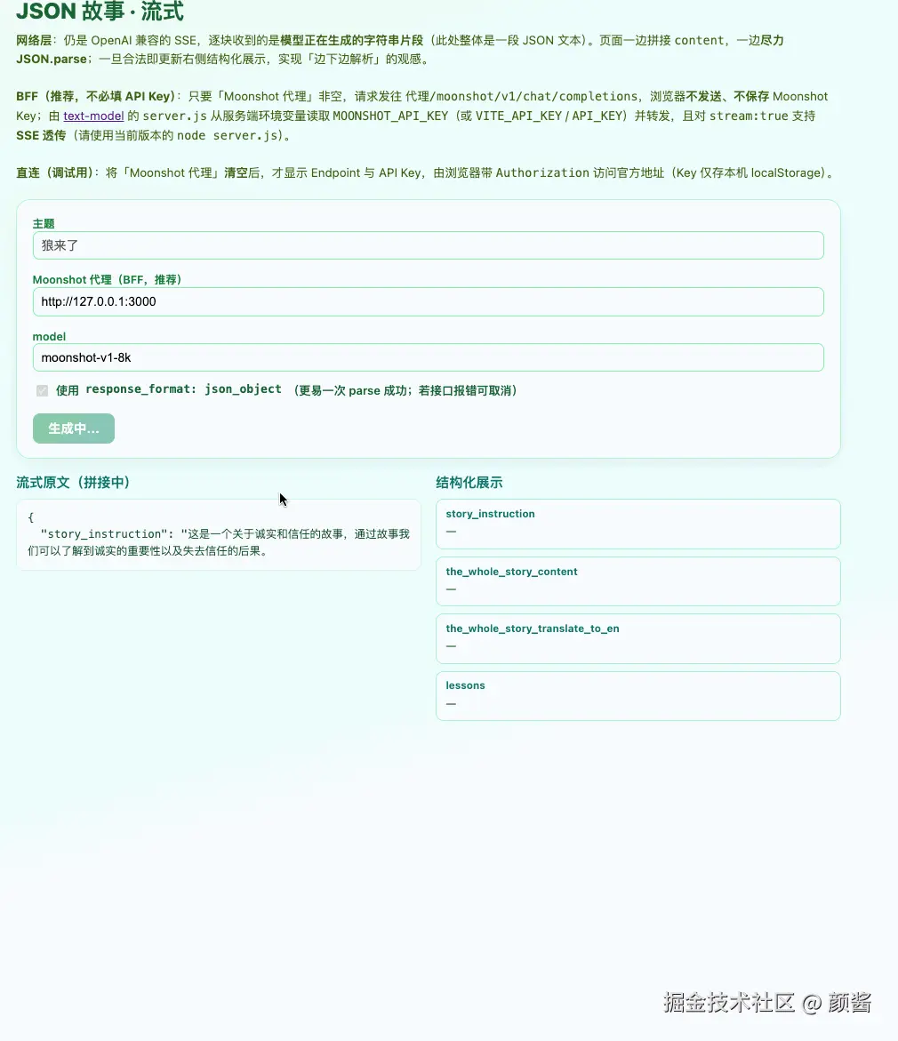 提示词强化 3:JSON 与「流式」------前后端原理、BFF、以及两个示例页