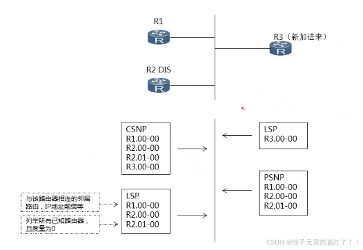 | CSNP | Complete Sequence Numbers PDU | 完整序列号 PDU,包含当前 LSPDB 中所有 LSP 的摘要 | 类似于 OSPF 的 DBD,用于同步数据库 |