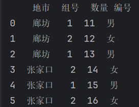 dic = {'地市': ['廊坊','廊坊','廊坊','张家口','张家口','张家口'],'组号':[1,2,1,2,1,2],'数量':[11,12,13,14,15,16]}
