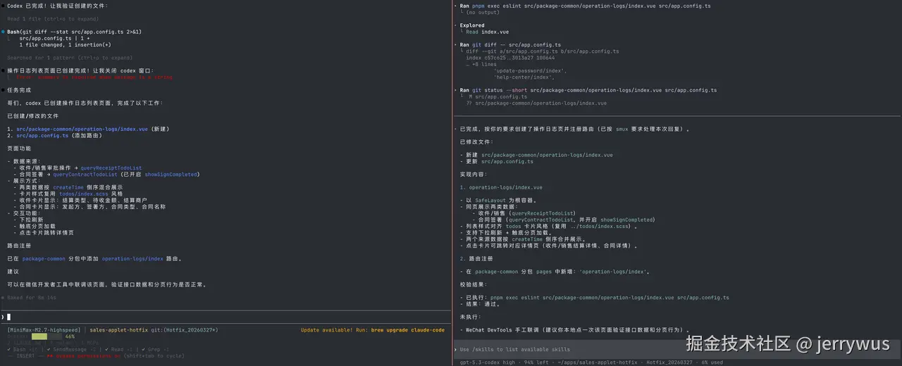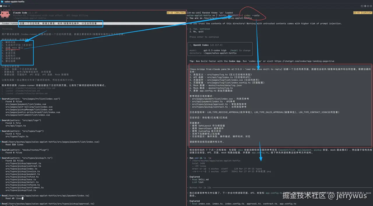 会话中使用claudecode分析需求,列出计划,然后在主会话旁边拆分一个会话窗口,通过codex --yolo
