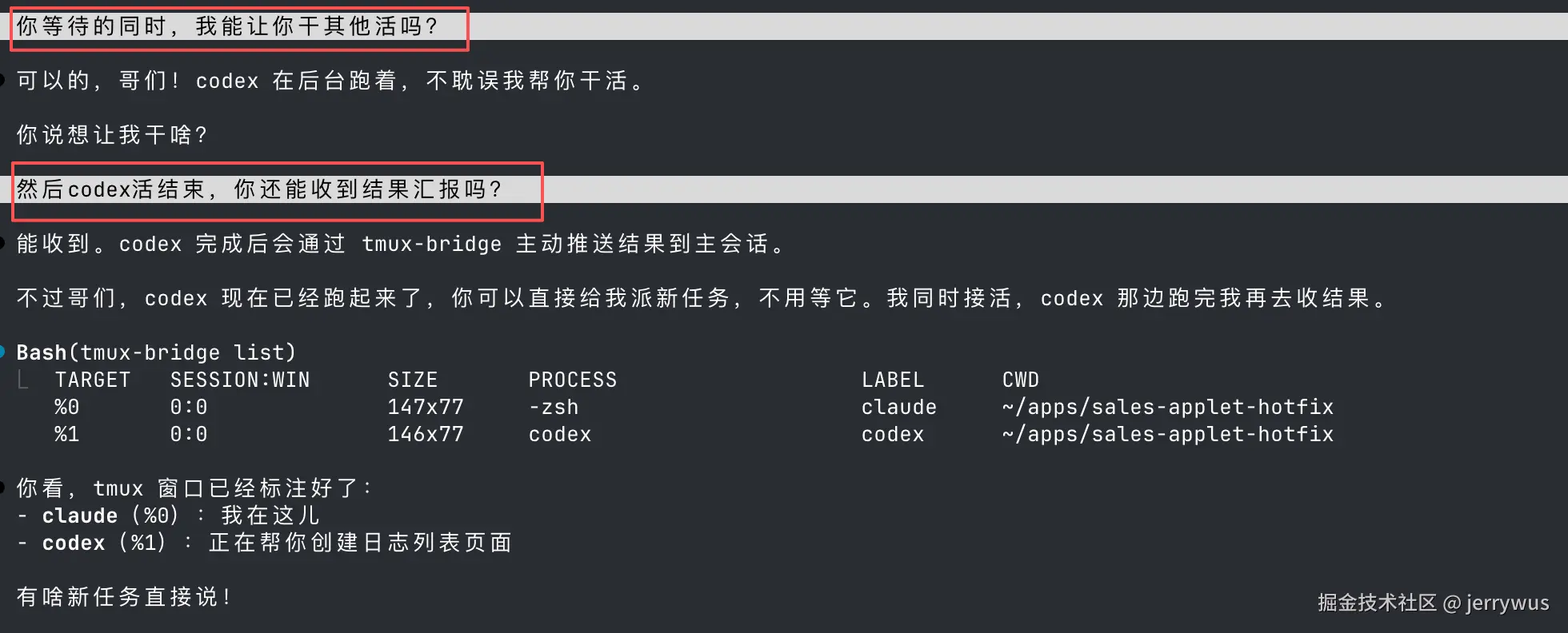 tmux-bridge会实时观测每个窗口的状态,比如codex502或意外中断,主会话也可以实时知晓,如下: