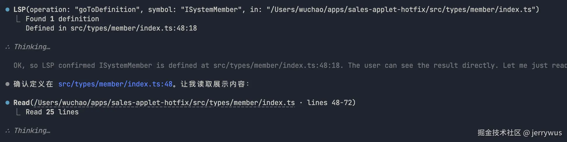 下面是实际的调用效果,图中的操作其实就是我们编码过程中 右键转到定义 的功能。(我自己测试了下,不是很稳定,有时候可以,有时候不行)