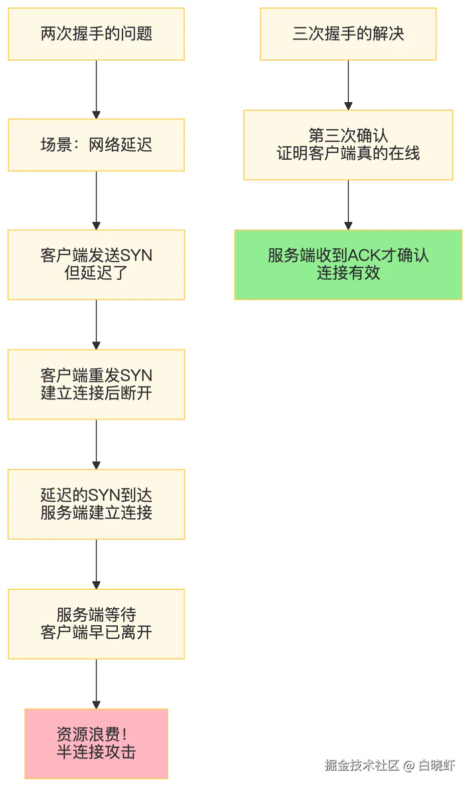 (我能听到你吗?我的序号是x) Note over Client,Server: 第二次握手:B 确认自己能发能收,A 确认B能收发 Server->>Client: SYN=1, ACK=1, seq=y, ack=x+1