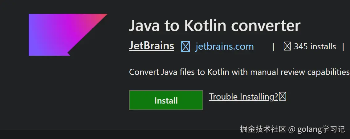 打开 VS Code 扩展市场,搜索 Java to Kotlin Converter (JetBrains 官方出品),点击安装。