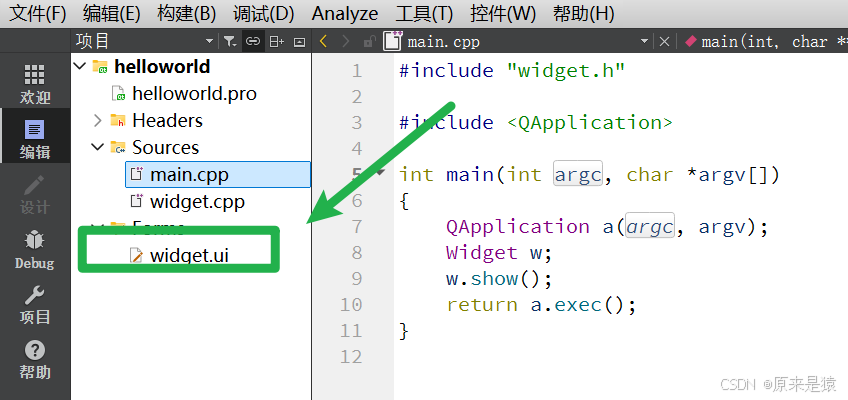 转到编辑区 -> widget.ui文件