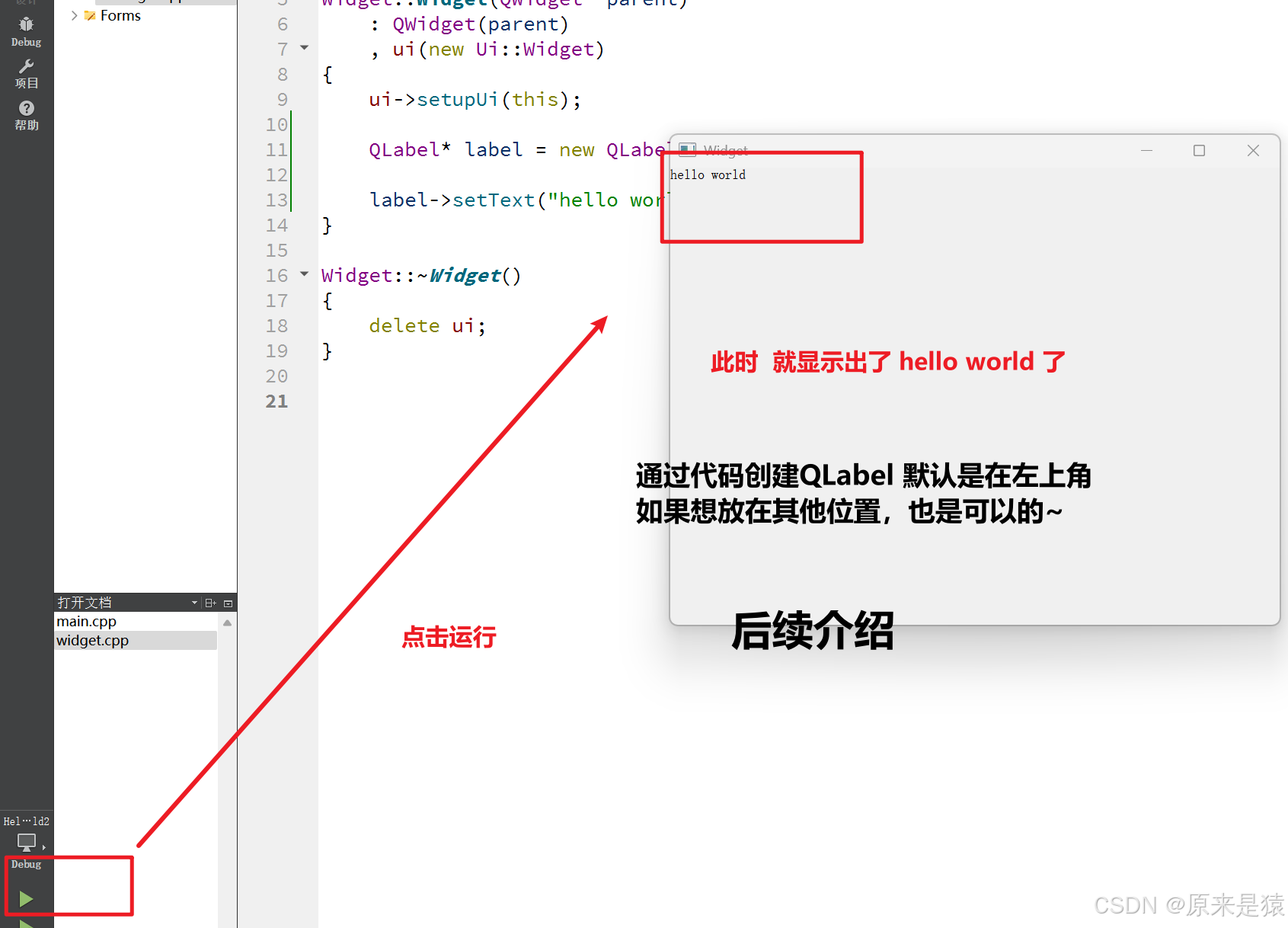 - 通过图形化的方式,在界面上创建除一个控件,显示hello world