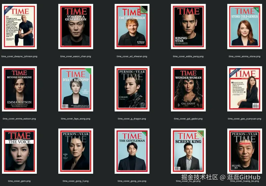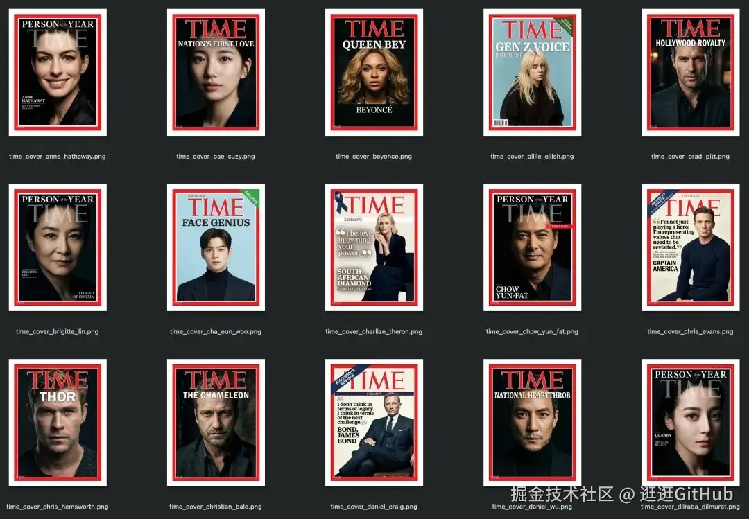 最终, Agent 集群高效率、高质量的生成了 100 个明星的时代杂志封面,效果非常不错。