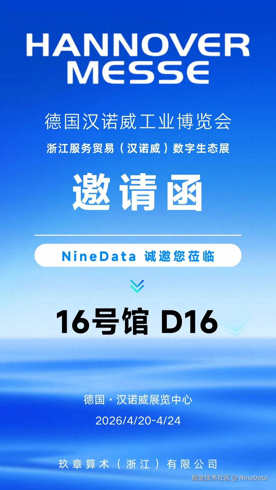 2026年4月20日至24日,德国汉诺威工业博览会在汉诺威展览中心举行。在浙江省商务厅组织下,NineData将作为浙江展团参展企业之一,亮相2026浙江服务贸易(汉诺威)数字生态展,向来自全球的客户、合作伙伴及行业观众展示企业级智能数据管理平台的核心能力。