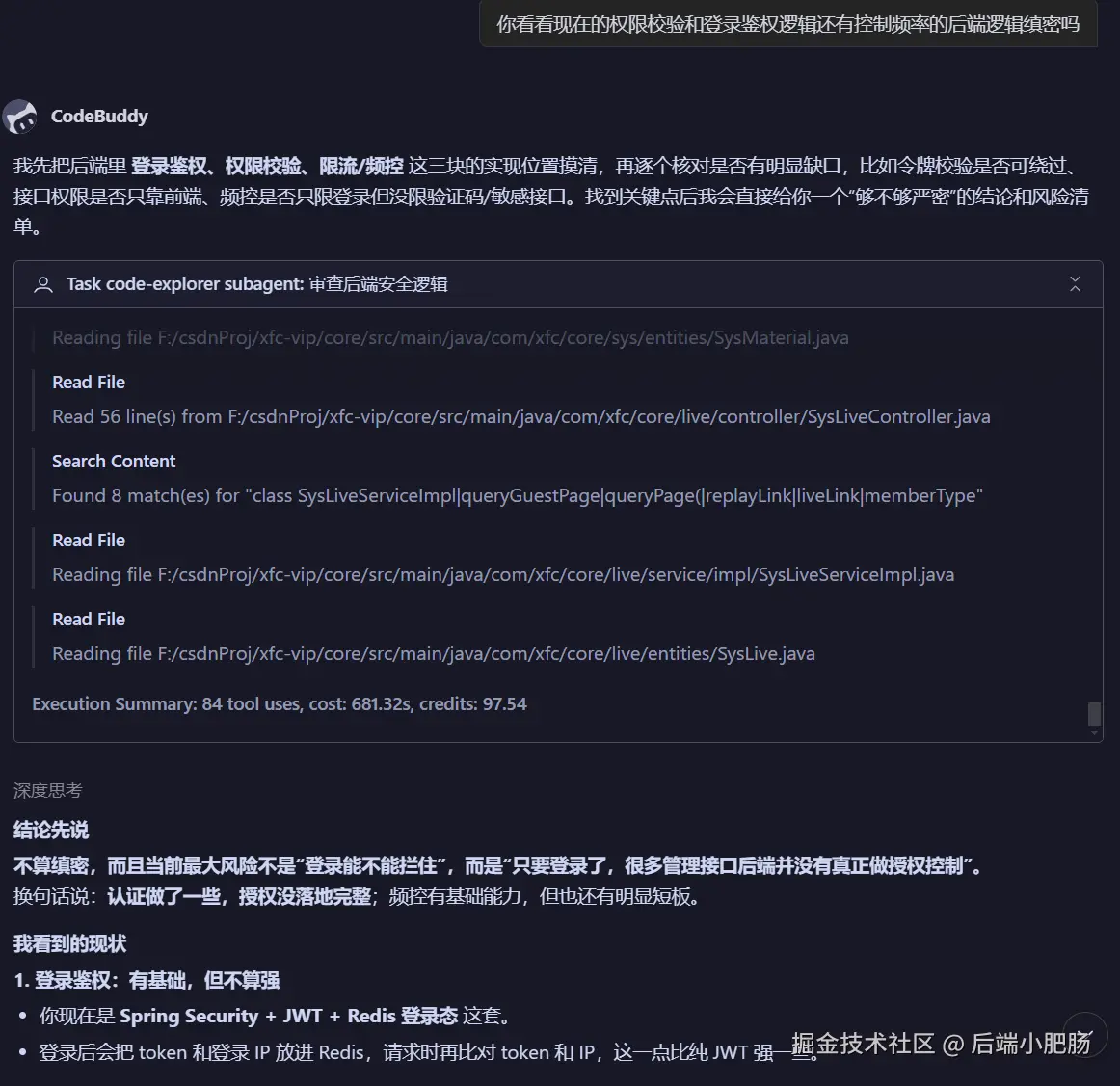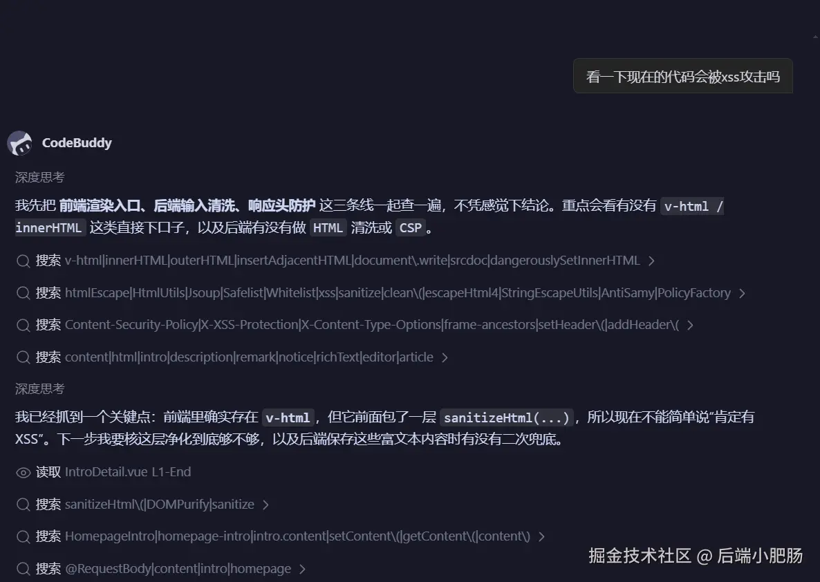 系统上线之前有一个点我觉得很多人容易忽略,就是XSS(跨站脚本攻击)。简单说就是有人在你的输入框里塞一段恶意代码,如果你没做过滤,这段代码就会在其他用户的浏览器里跑起来,轻则弹窗恶作剧,重则盗取用户信息。我在做社群系统的时候也专门让Codebuddy帮我检查了一遍,把用户输入的地方都做了转义处理。这个不难,但不做的话后患无穷,建议大家做系统的时候别漏掉这一步。