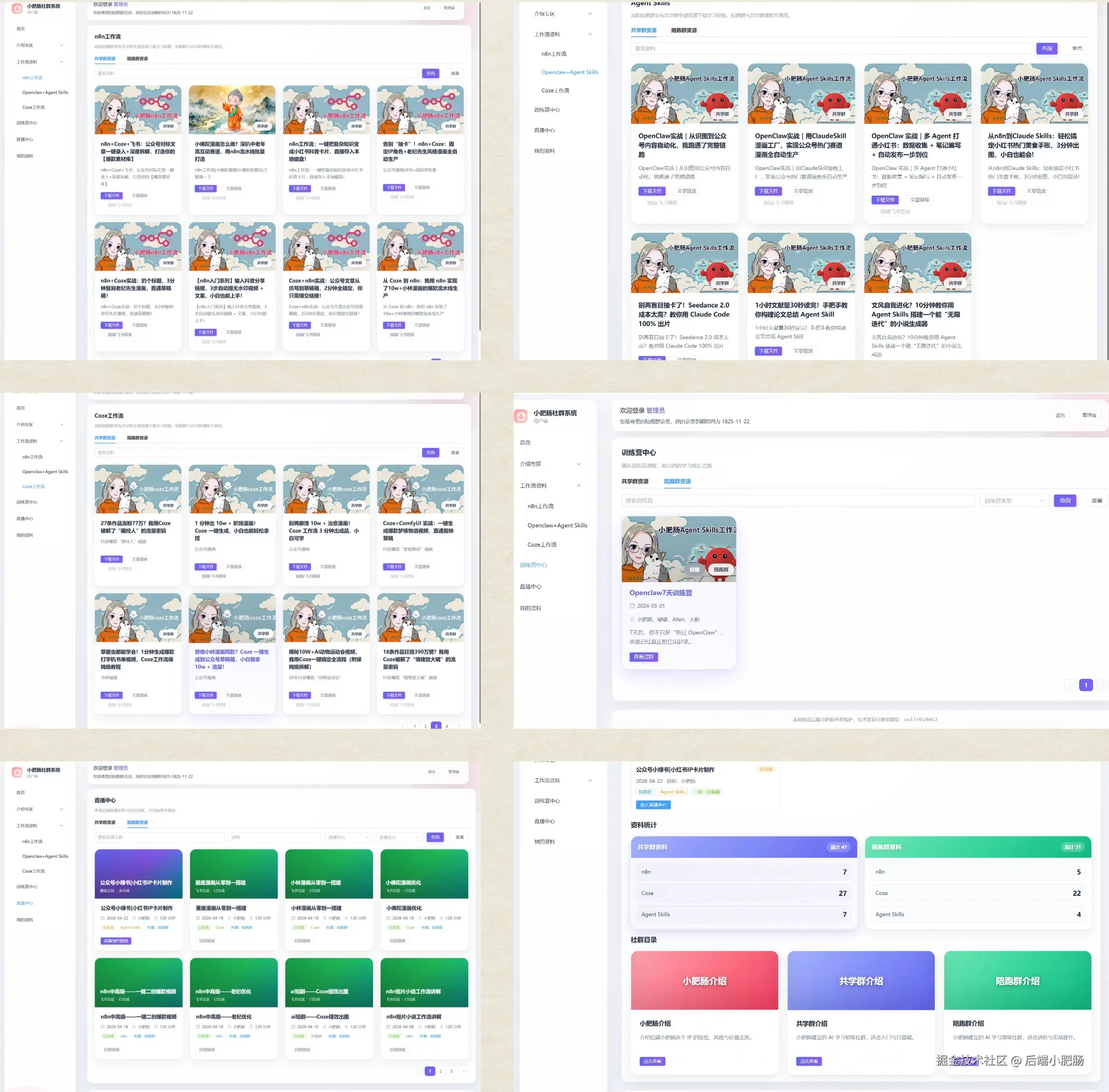 这个系统的核心就是把我之前做的 工作流 ,skill、直播教学、训练营资料做集中归纳,之前这些资料都是放在 飞书 ,四处分散,大家反馈找资料费劲。我也意识到了这一点,于是就花了一个月跟Codebuddy完成了这个系统。 有一说一这个系统在AI工具的加持下开发周期也就一周,主要是我平时精力太分散(一人公司大家懂的),于是断断续续弄了一个月才上线。