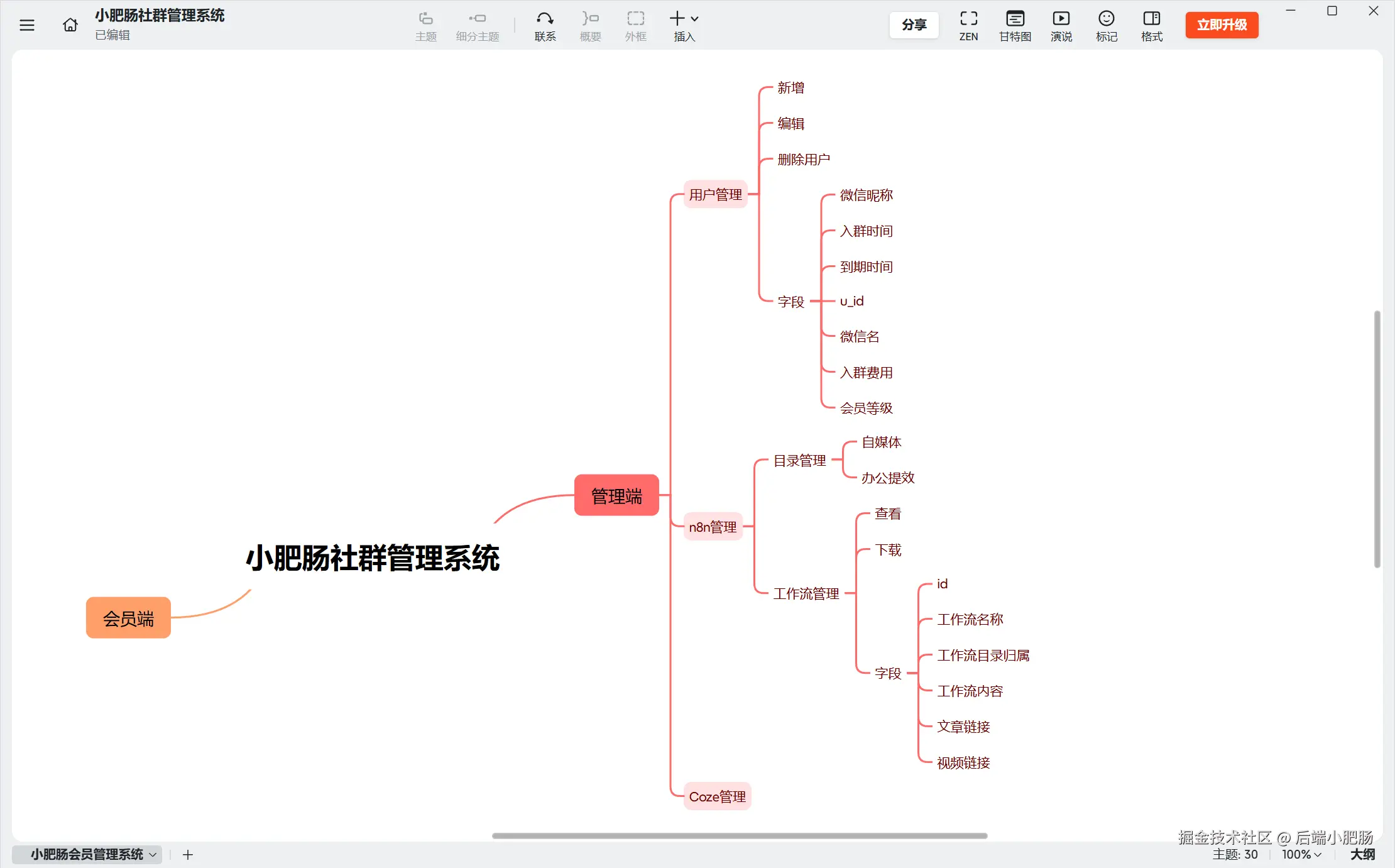 做系统首先是拉功能模块,我比较习惯用思维导图,大家梳理功能模块的时间也强推思维导图,逻辑会越来越清晰,下面不是终版的功能模块,是中间产物,终版的找不到了....功能模块如何罗列这个我会在以后另写写一篇文章来详尽描述。