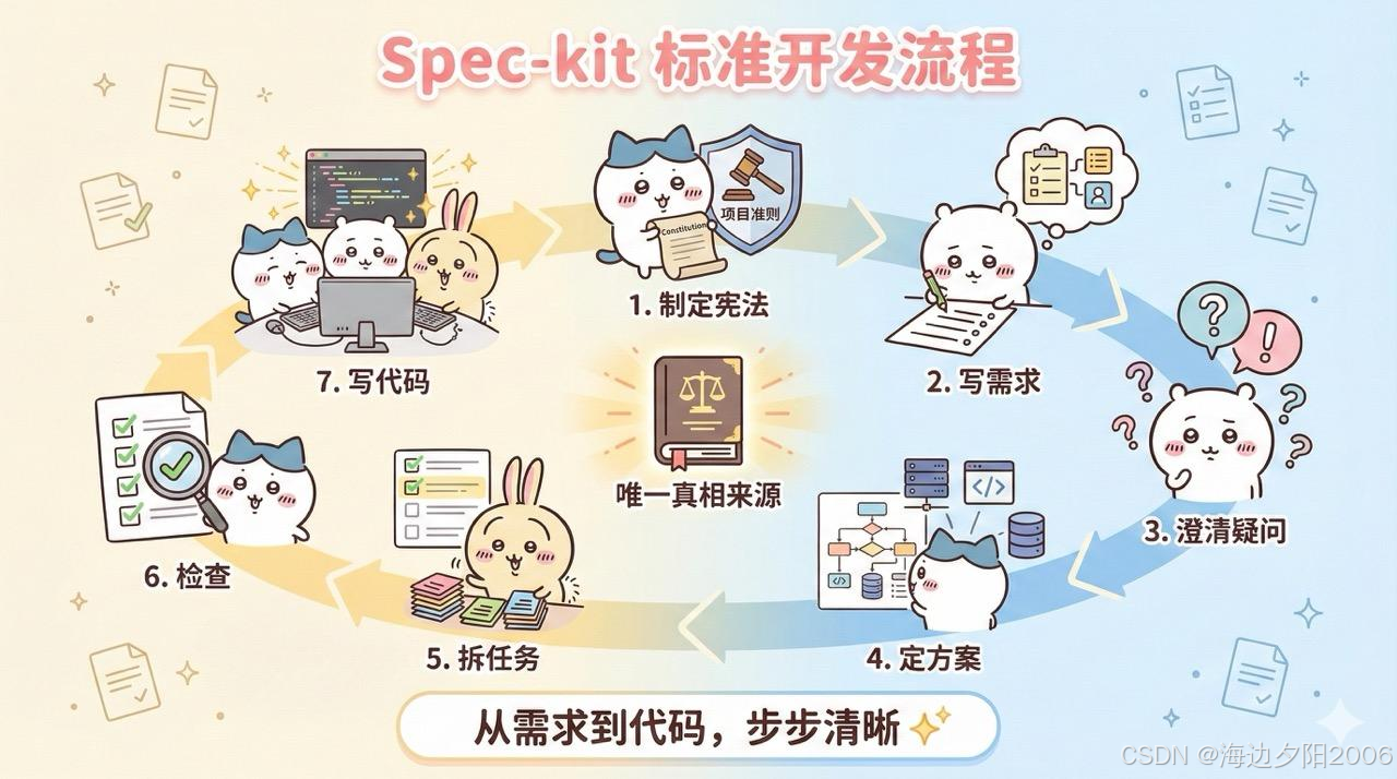 然而,随着Vibe Coding在实践中的广泛应用,其固有的局限性也逐渐暴露出来。由于完全依赖自然语言描述和AI的自由生成,Vibe Coding在面对复杂业务逻辑、长期维护项目和团队协作场景时,常常表现出代码质量不稳定、架构漂移、上下文丢失等问题。为了解决这些挑战,"Spec-Driven Development"(规格驱动开发,简称SDD)作为一种面向AI时代的新型开发方法论被提出,它将结构化的规范文档作为人机协作的"动态契约",在保持Vibe Coding高效性的同时,为开发过程引入了必要的工程化和可维护性保障。