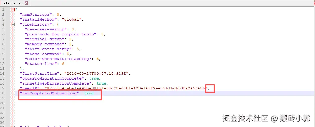 在你的文件中加上"hasCompletedOnboarding": true,注意是json的结构,上一行的末尾要加上,