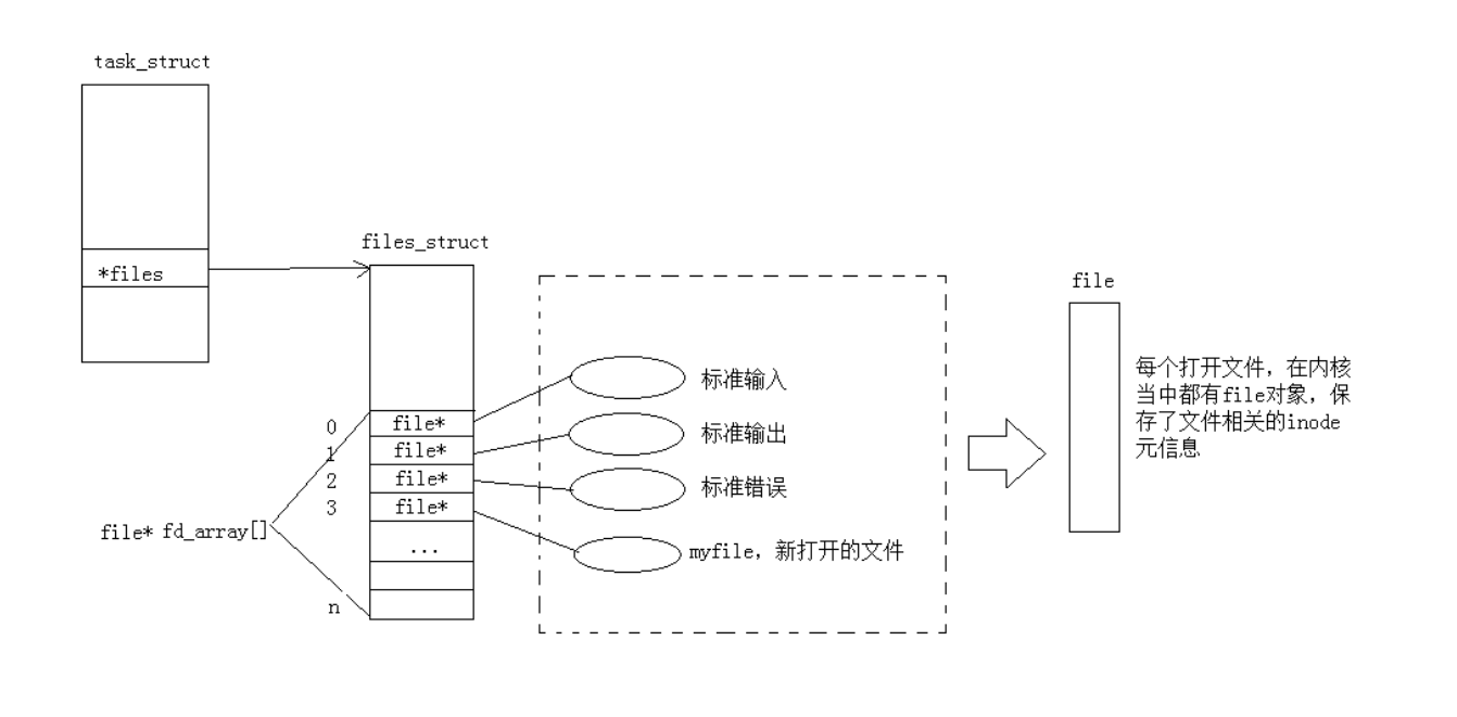 我们知道文件的创建和操作都是通过进程来完成的,我们的进程都会有一个task_struct结构体对象,在这个结构体对象中有一个FILE*的结构体指针,这个指针就是指向我们的文件描述表的