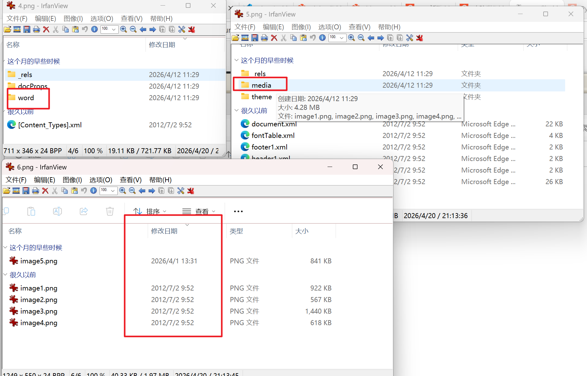 然后,还想先找到是哪张图片,但是我存储下来的图片没有找到任何信息,包括exif,也许我另存的时候丢失了,由于docx其实是一个压缩文件,所以直接改后缀名解压: