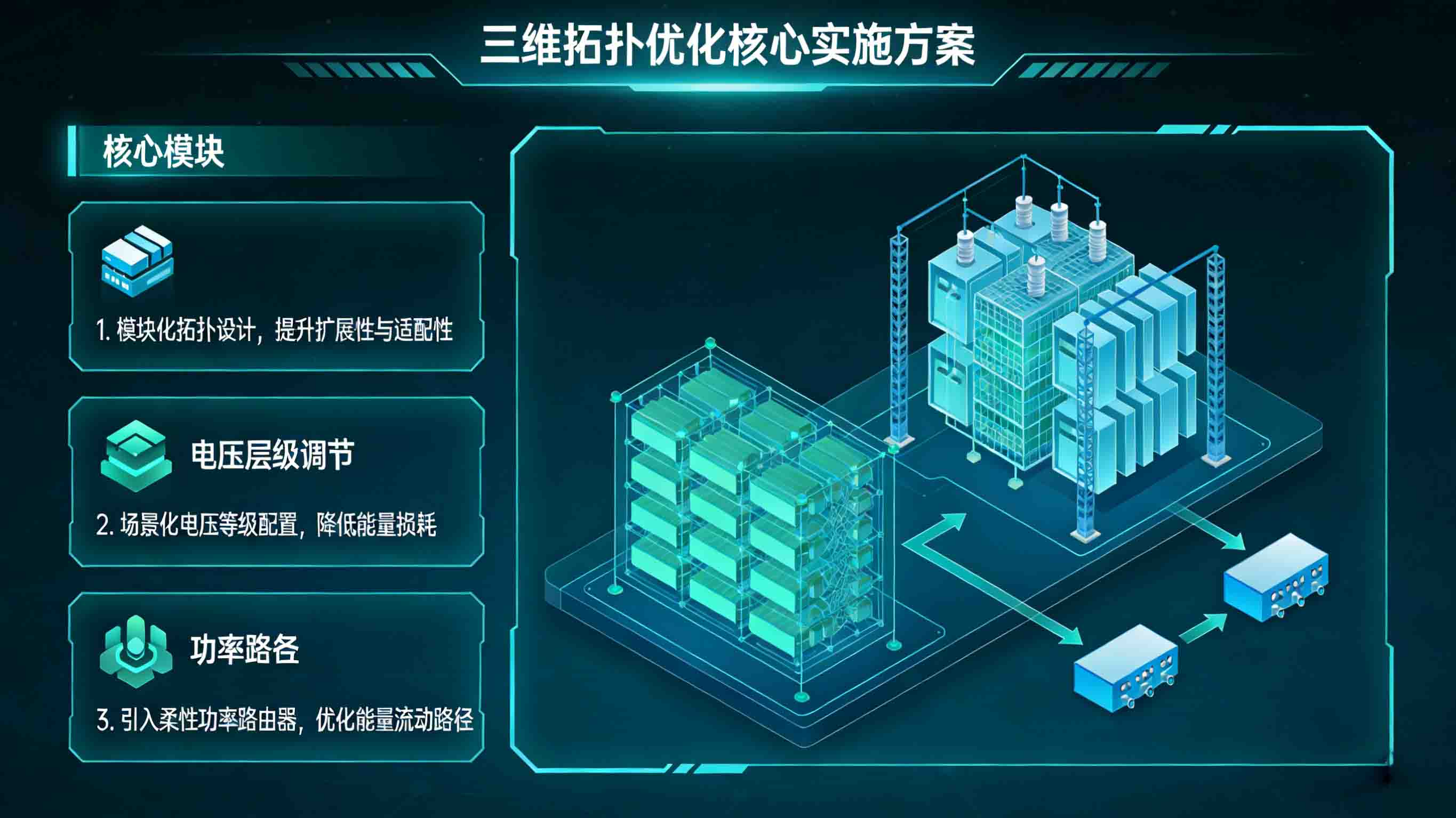 针对上述痛点,结合工程实践经验,提出"模块化设计+场景化适配+电压等级优化"的三维拓扑优化方案,实现效率与灵活性的平衡,降低设计与落地成本。