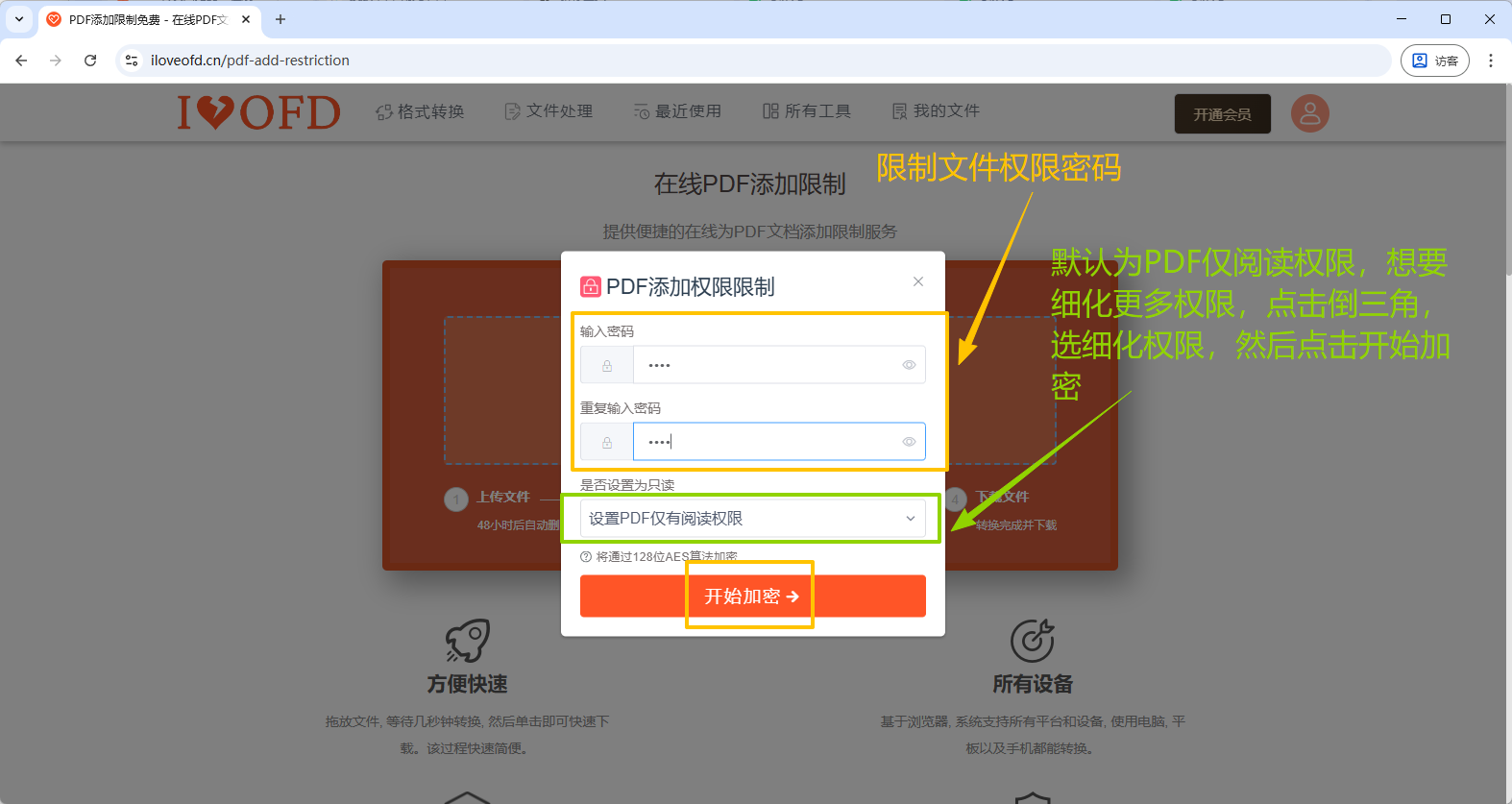 2.弹框中设置密码或权限。点击开始加密。