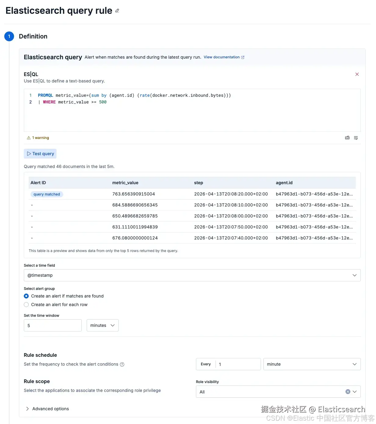选择 @timestamp 作为时间字段,然后继续完成规则配置的其余部分。