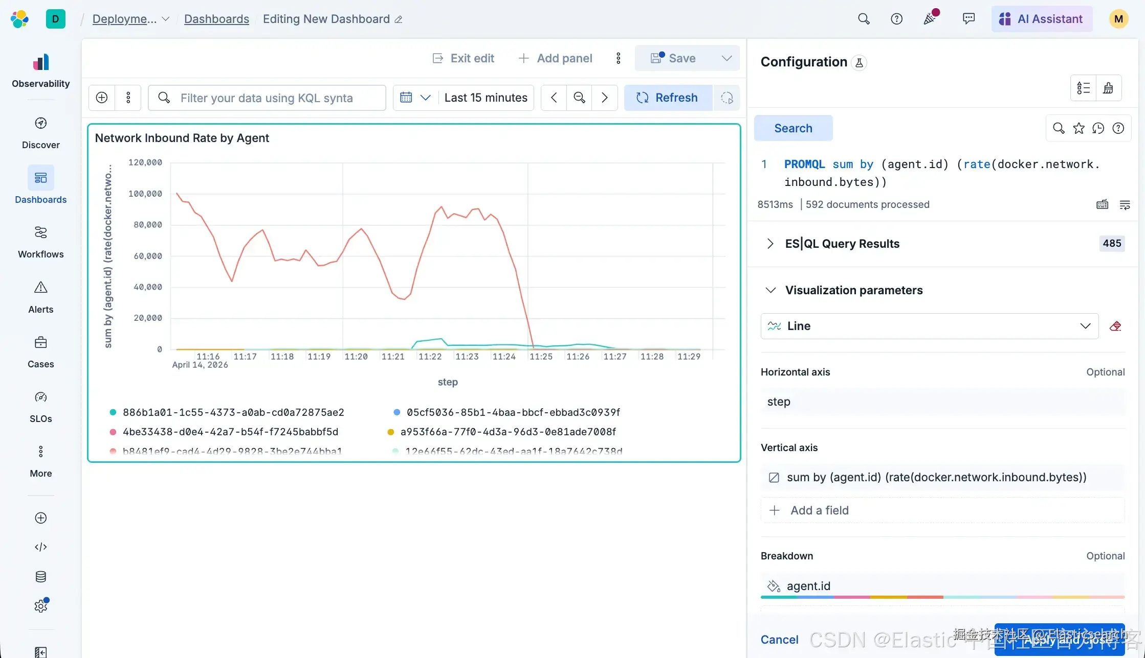 `PROMQL sum by (agent.id) (rate(docker.network.inbound.bytes))` AI写代码